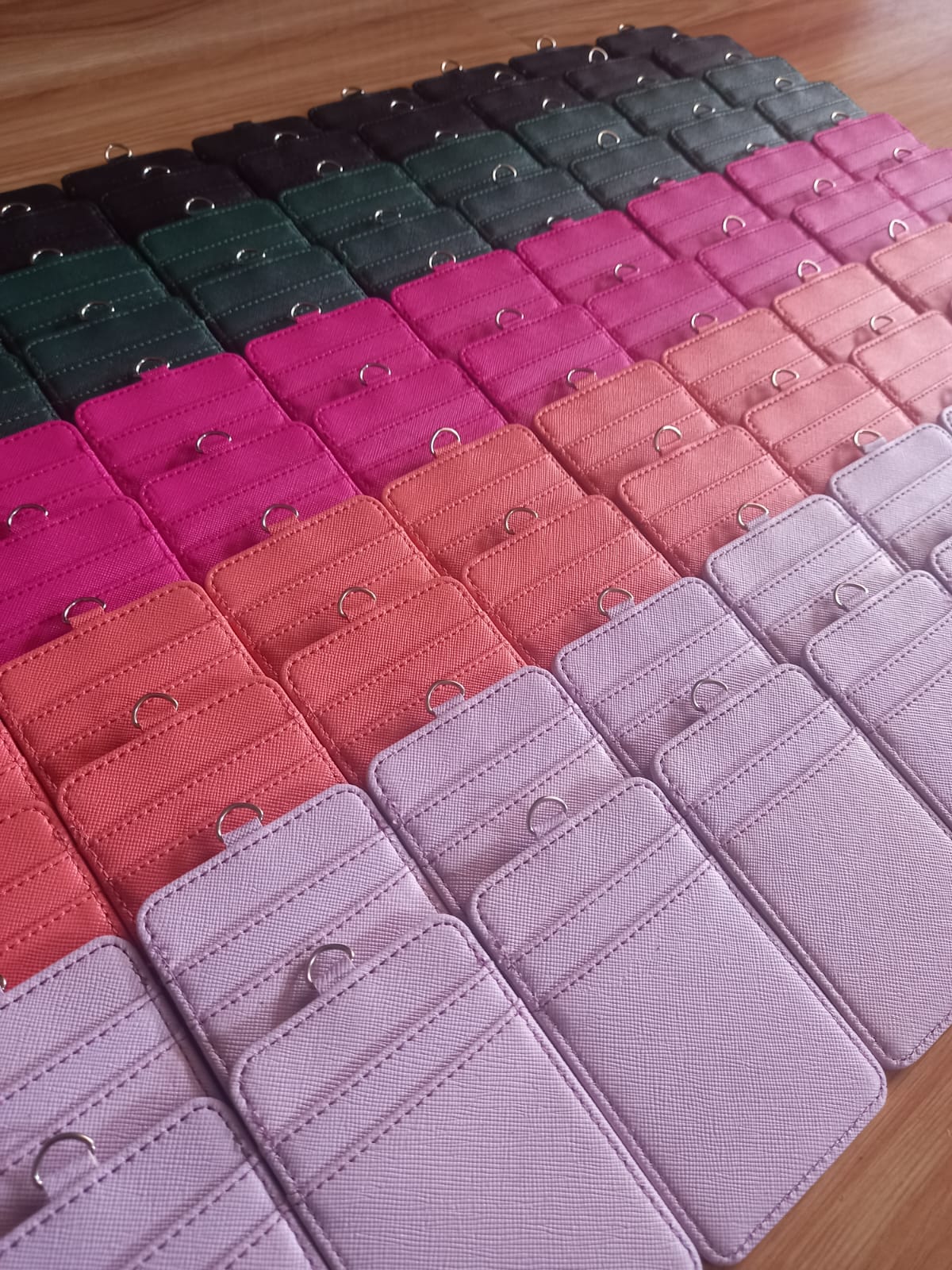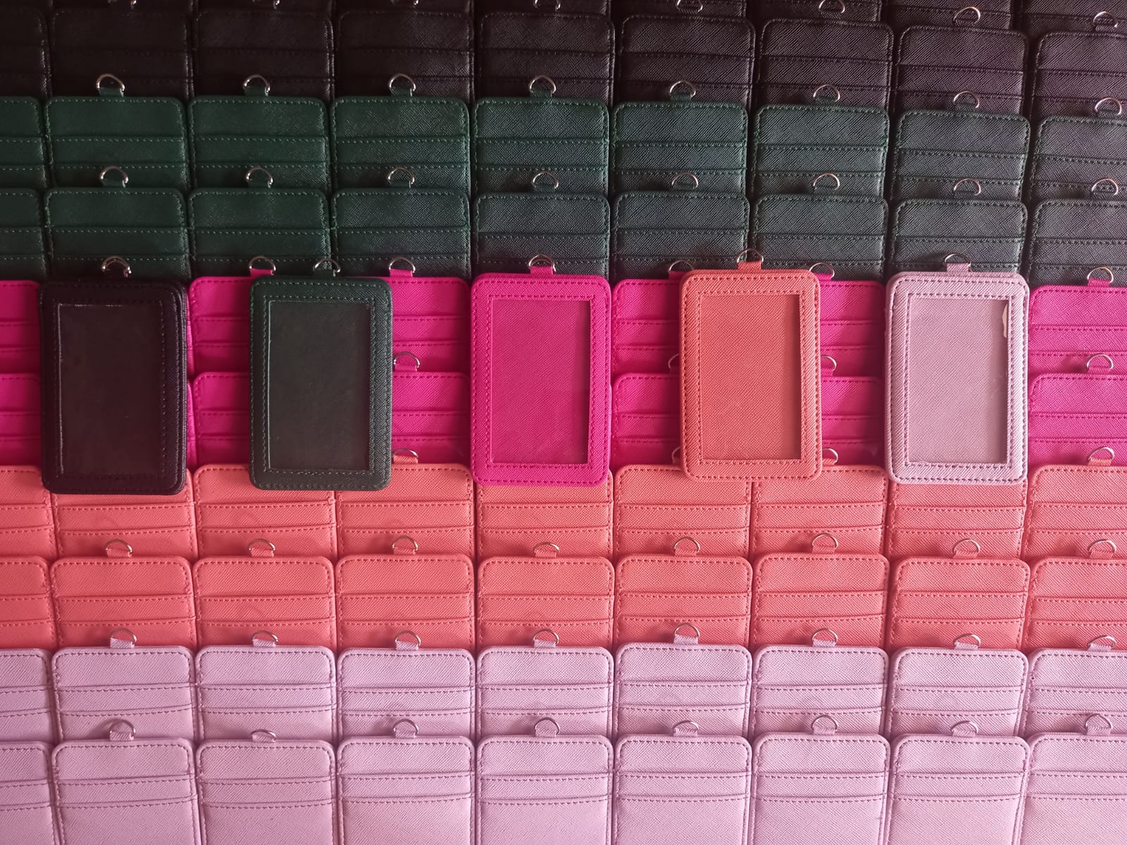 Gambar yang terlampir di atas merupakan salah satu contoh lanyard id card tanpa tali hasil produksi dari Nusamstudio. Lanyard ini menggunakan safiano sebagai bahan utama pembuatannya. Bisa dilihat dalam gambar tersebut, terdapat dua kompartemen slot penyimpanan kartu dan satu slot untuk menyimpan foto atau kartu identitas pegawai. Variasi warna yang dipakai juga terlihat cantik dan memikat mata.